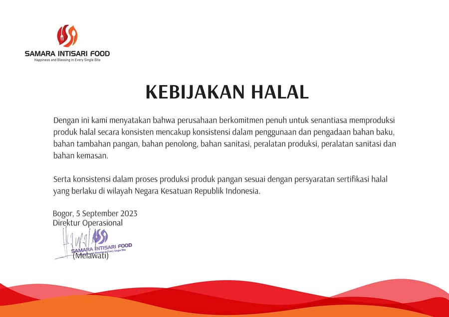 PT Samara Intisari Food senantiasa selalu menjaga komitmen kebijakan halal dari setiap produk yang di produksi di PT Samara Intisari Food. Kami sadar, bahwa produk yang baik berasal dari proses produksi yang baik, rapi, memperhatikan mutu dan juga ke halal-annya.