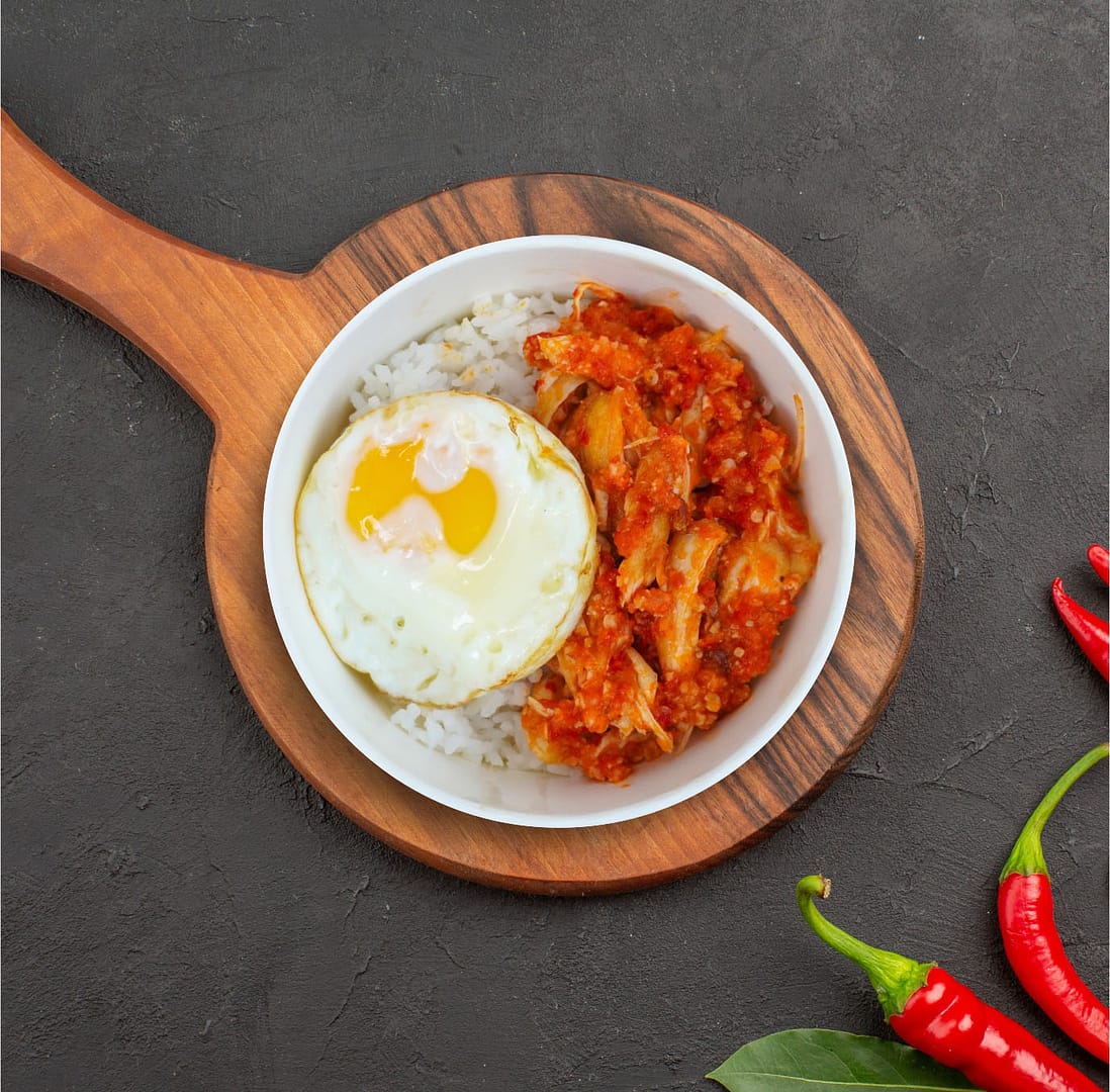 Nasi Putih, Telur Ceplok, Chicken Karage dan Sambal Matah